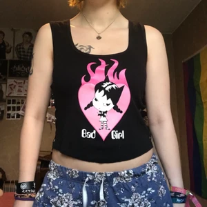 En super coolt linne med Säkerhetsnålar längs med båda sidorna och ett tryck med en tjej i ett hjärta med texten bad girl. Lappen är kvar, aldrig använd endast testad. Storlek M/L. Kan mötas upp i Stockholm eller posta. Frakt 44kr. Meddela mig om eventuella frågor.