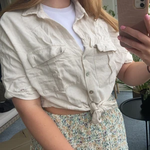 Kort skjortliknande top från Bershka i London med små detaljer som fickor knappar och rosett. Har tyvärr spruckit lite på ärmen (syns på bild 1) men inget som syns när man rullar upp den som den ska vara. Men därav säljer jag den för endast 30 kr 🤍