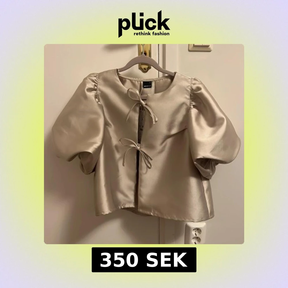 Champagnefärgad blus från Gina Tricot - Supersnygg champagnefärgad blus från Gina Tricot med puffiga ärmar och croppad passform. Blusen har knytning framtill och är gjord i ett glansigt satinliknande material som ger en lyxig känsla. Perfekt för dig som vill sticka ut med coola detaljer och volym.