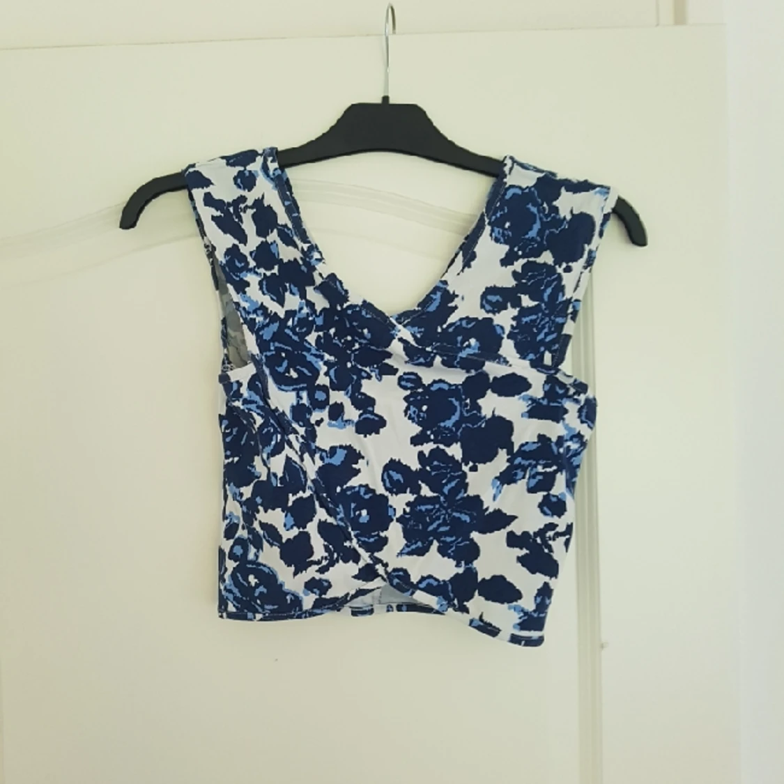 Tight magtröja i vit med blått blommigt mönster. Kan passa en storlek S också men då är den inte lika åtsittande. Köparen står för frakt. OBS, katt i hemmet.