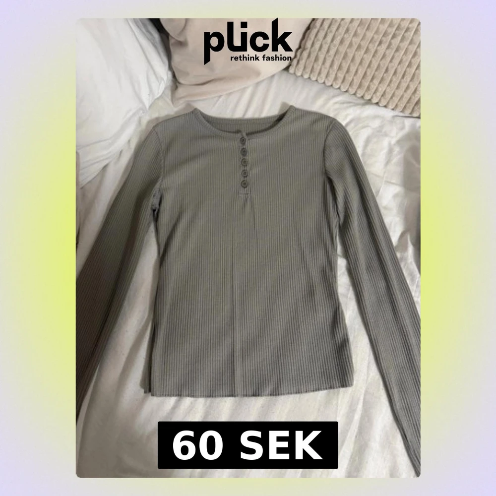 Säljer en grå ribbad långärmad topp med rund halsringning och knappar framtill. Toppen har en slim passform och är tillverkad i mjukt bomullsmaterial, perfekt för lager på lager eller att bära som den är.