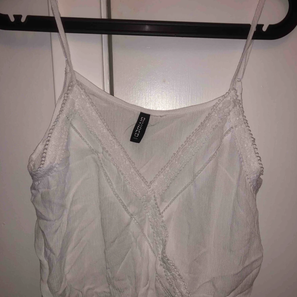 Ett vitt croppat linne från hm Storlek 38 men passar en 34-36 i och med att man kan justera banden och den är ganska kort. Aldrig använd Står inte för frakt
