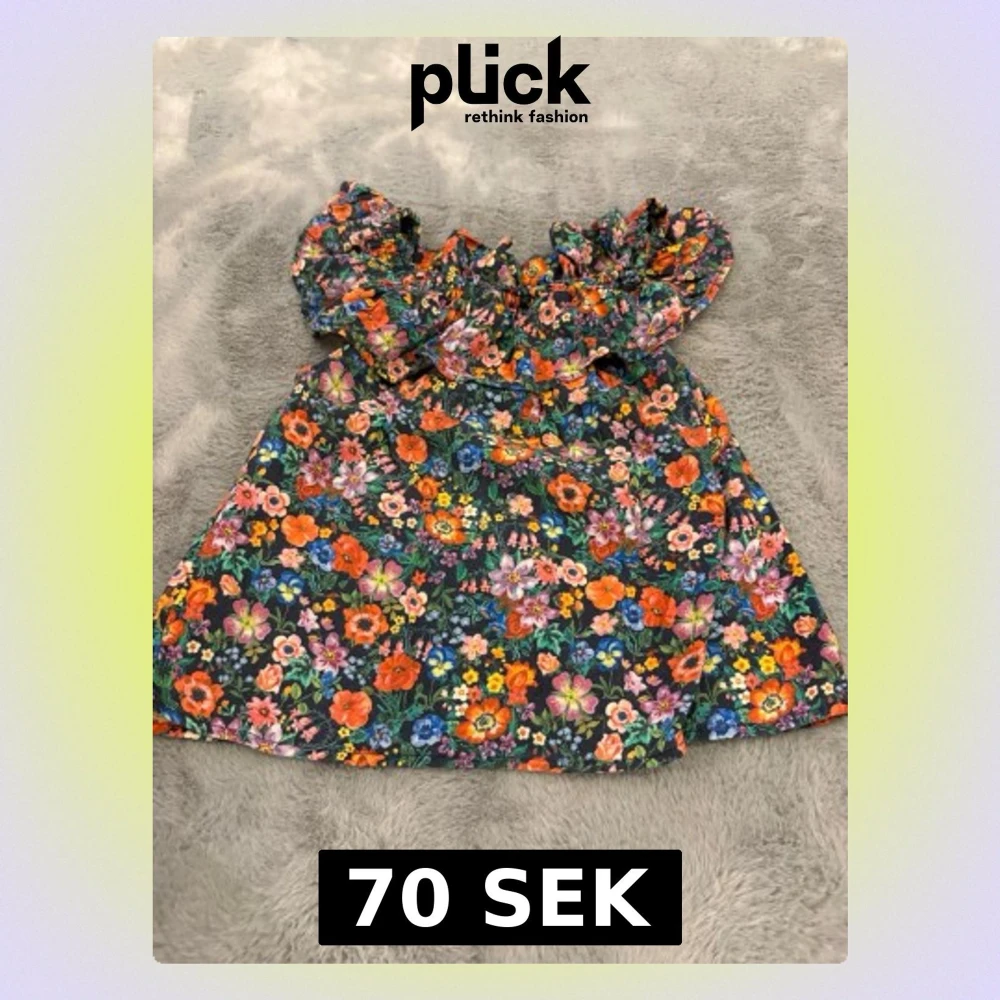 Supersöt offshoulder topp från H&M i storlek 140, täckt av färgglada blommor i orange, rosa, blått och lila på mörk botten. Toppen har volangdetaljer runt axlarna och är perfekt för sommarens alla äventyr.