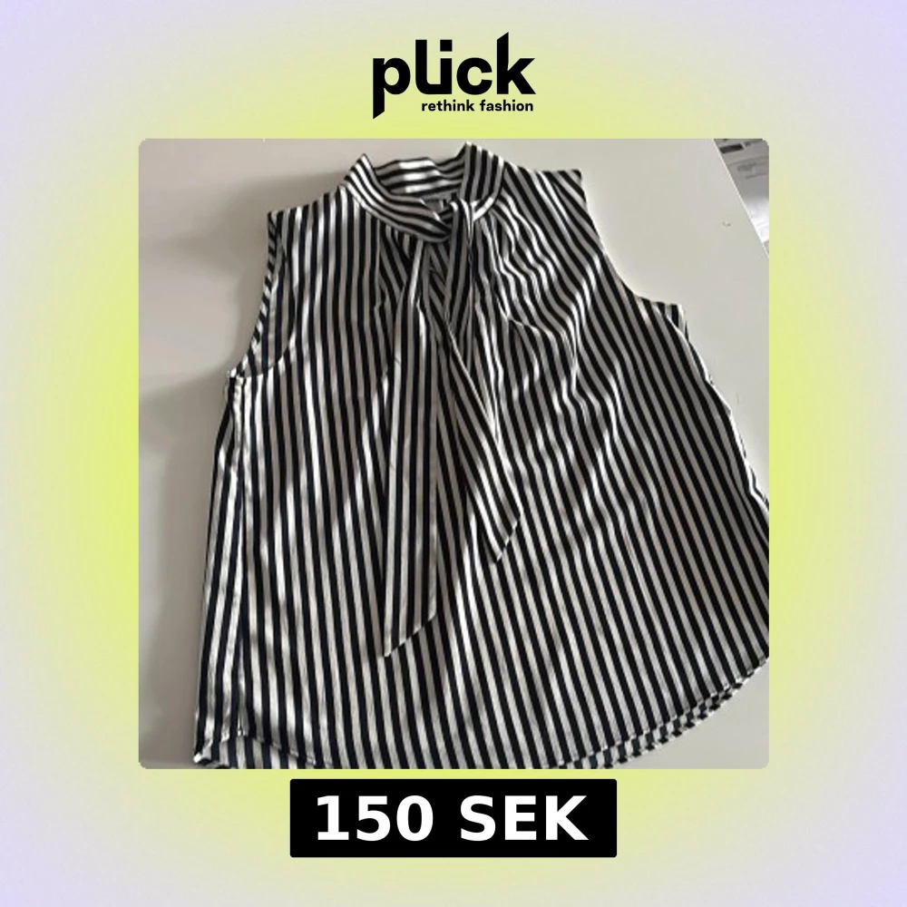 Snygg ärmlös blus från H&M med svartvita vertikala ränder och knytdetalj vid halsen. Blusen har en rak passform och är tillverkad i ett mjukt, lätt material som ger ett dressat intryck. Perfekt för dig som gillar stilrena och trendiga plagg.