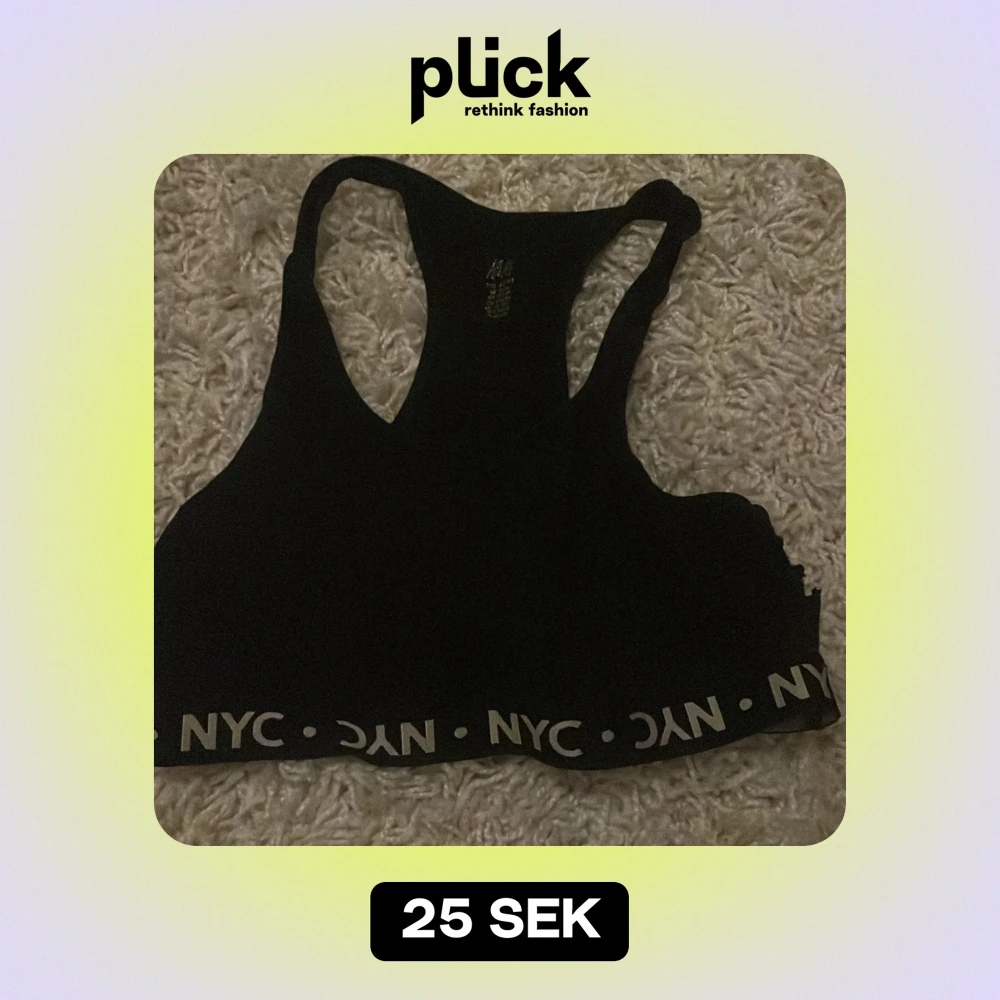 Säljer en svart sporttopp från H&M i storlek M. Den har en elastisk kant med texten 'NYC' runtom. Perfekt för träning eller en aktiv dag. Toppen är i bra skick och redo för nya äventyr!