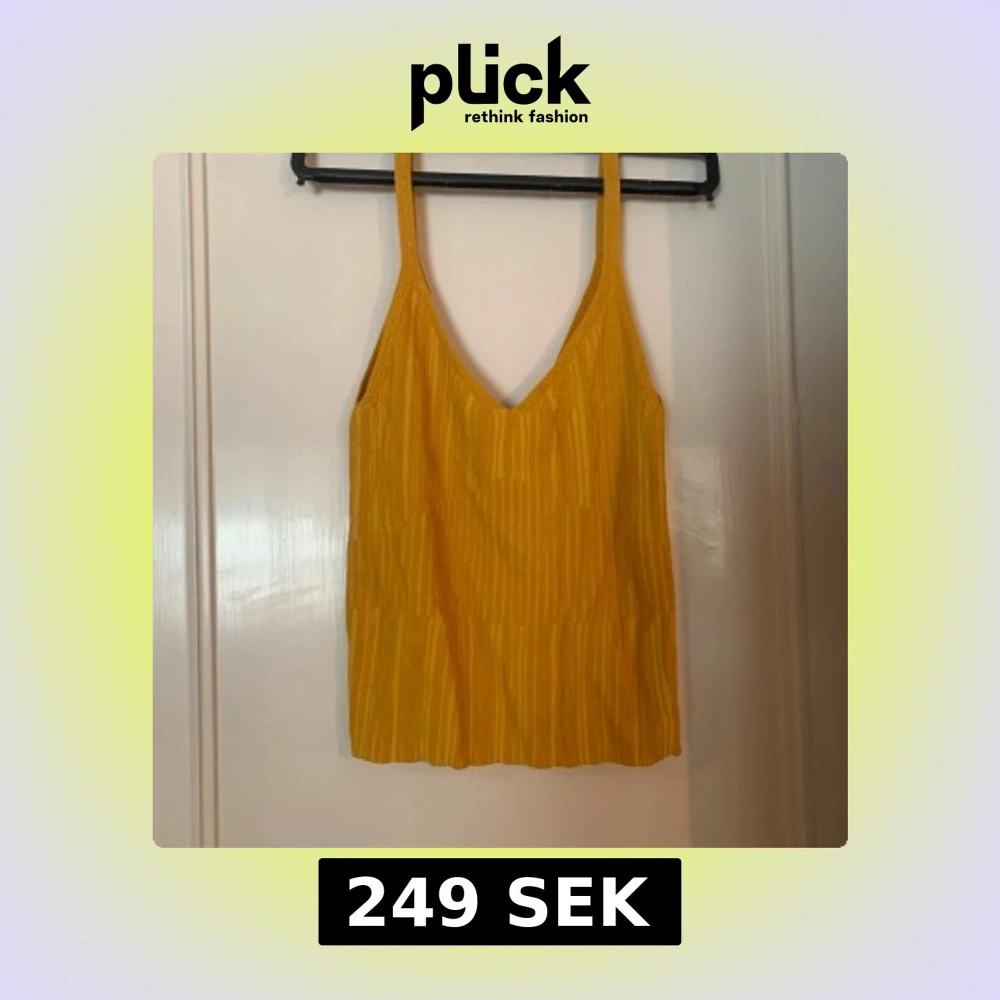 Säljer en solgul ribbad linnetopp från H&M. Toppen har smala axelband och en v-ringad design som ger en somrig känsla. Perfekt för varma dagar!