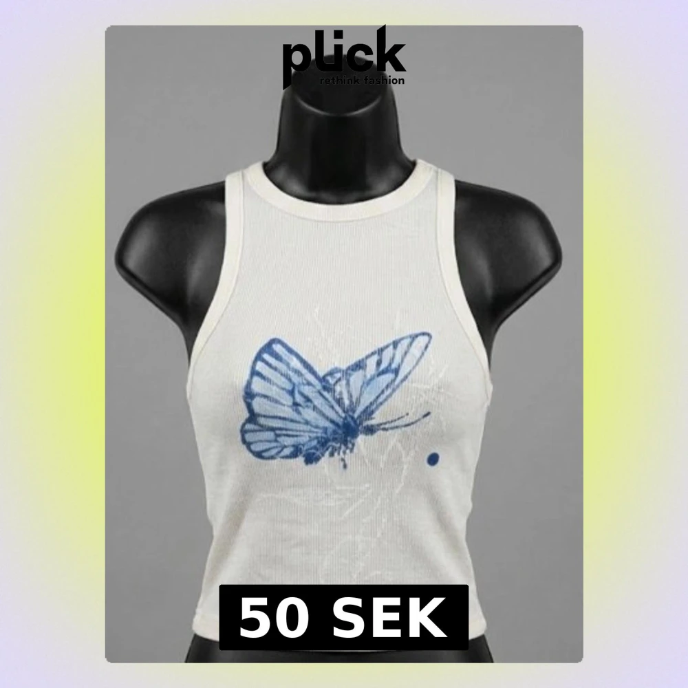 Säljer en vit croppad linnetopp med ribbad struktur och ett stort blått fjärilstryck framtill. Toppen har breda axelband och rund halsringning, perfekt för en trendig och avslappnad look.