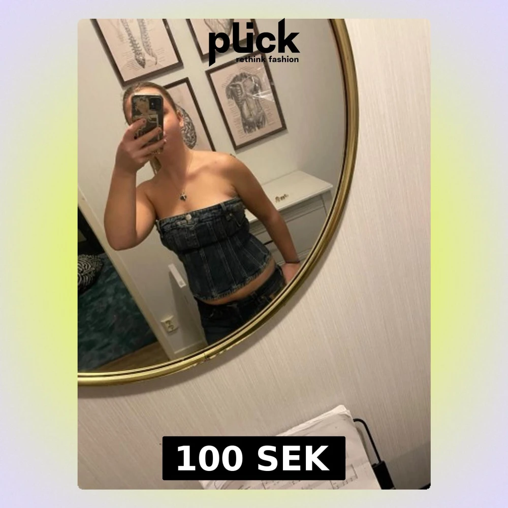 Säljer en snygg mörkblå tubtopp i denim med markerade sömmar och knappdetalj framtill. Toppen är axelbandslös och har en tight passform som framhäver midjan. Perfekt att styla med jeans eller kjol för en cool look.