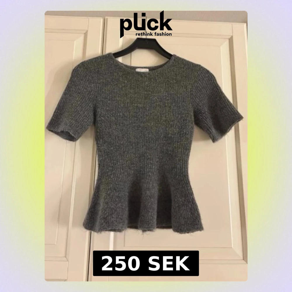 Säljer en grå ribbad topp från H&M i storlek XS. Toppen har korta ärmar, rund halsringning och en lätt utsvängd midja som ger en snygg siluett. Perfekt att styla med jeans eller kjol för en trendig look.