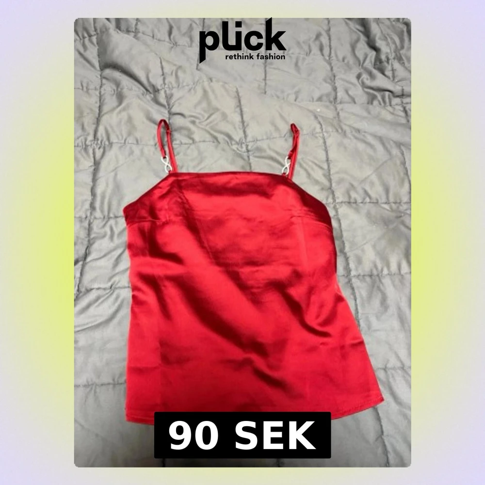 Snygg röd linnetopp från H&M i satinliknande material. Axelbanden är tunna och har en glittrig strassdetalj som ger extra bling. Modellen är figurnära och toppen är ärmlös. Storlek XS