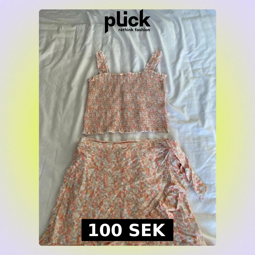 Supersöt linnetopp med kjol från KappAhl i storlek 170. Toppen har ett smockat tyg med volangkant och breda axelband. Mönstret är blommigt i pastelliga toner av rosa, orange, beige och lite grönt. Perfekt för sommarens alla dagar!