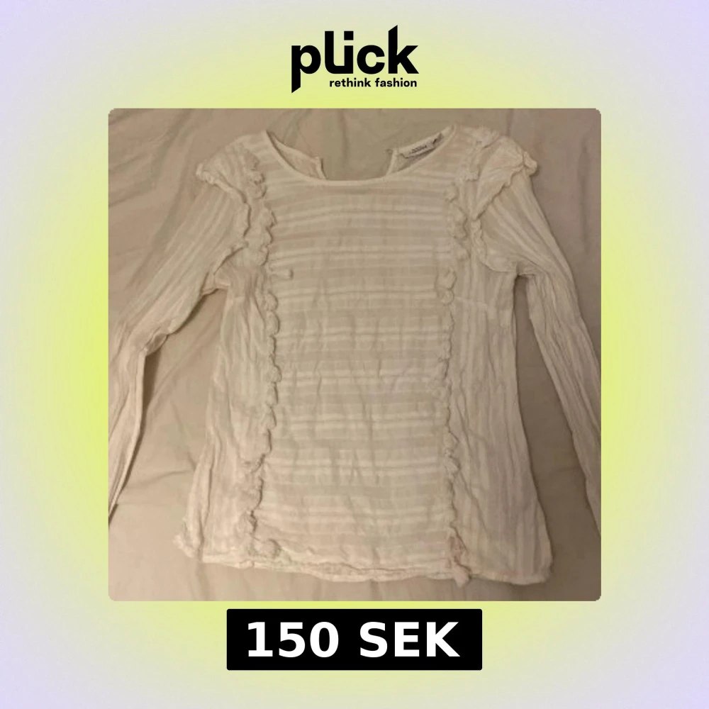 Säljer en vit blus från KappAhl i storlek 38. Blusen har långärmade ärmar, tunna ränder och dekorativa volanger längs axlar och framstycke. Materialet känns lätt och luftigt, perfekt för vår och sommar. Snygg att matcha med jeans eller kjol!nöstan aldrig använt
