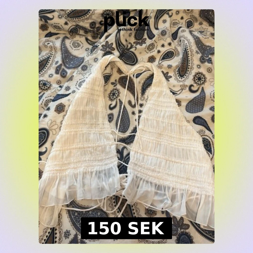 Supersöt vit omlottopp med halterneck och knyt i ryggen. Toppen har volangkant nertill och är gjord i ett tunt, luftigt material som passar perfekt till sommaren. Perfekt för att skapa en trendig och avslappnad look.