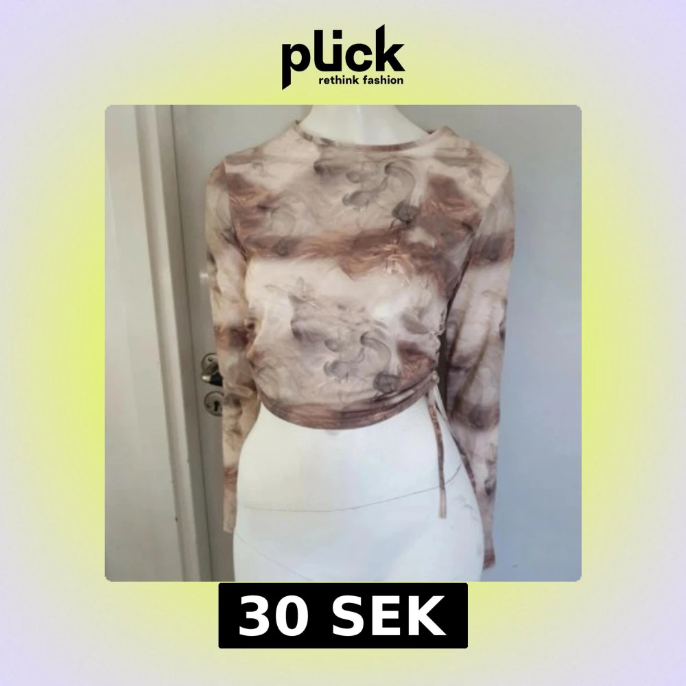 Säljer en långärmad mesh topp i beige och bruna toner med abstrakt mönster. Toppen är croppad och har snygg snörning på sidan som ger en cool rynkad effekt.