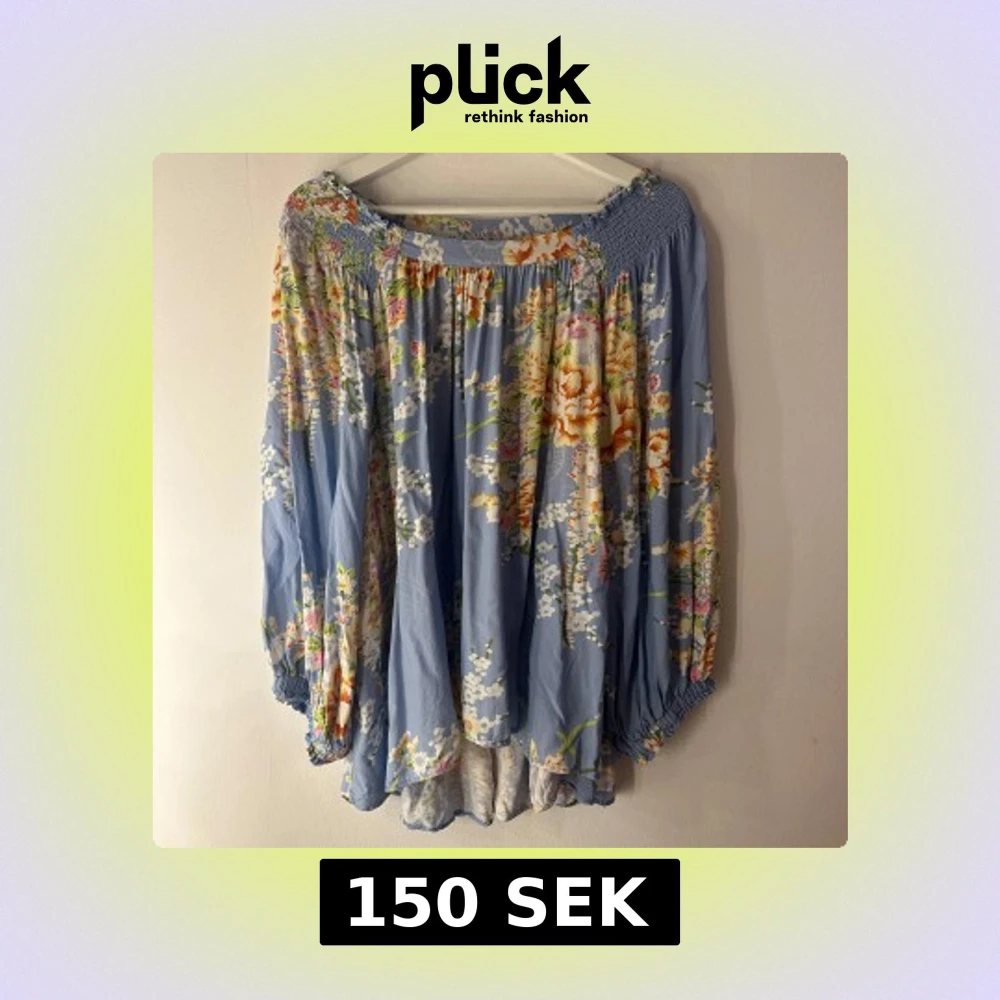 Superfin blommig blus i ljusblått med stora, färgglada blommor i vitt, orange och rosa. Vida långa ärmar med resår vid axlar och ärmslut ger en avslappnad och flowy vibe. Tillverkad i 100% viskos som känns lätt och luftig. Perfekt för vår och sommar! Storlek L men något stor i storleken