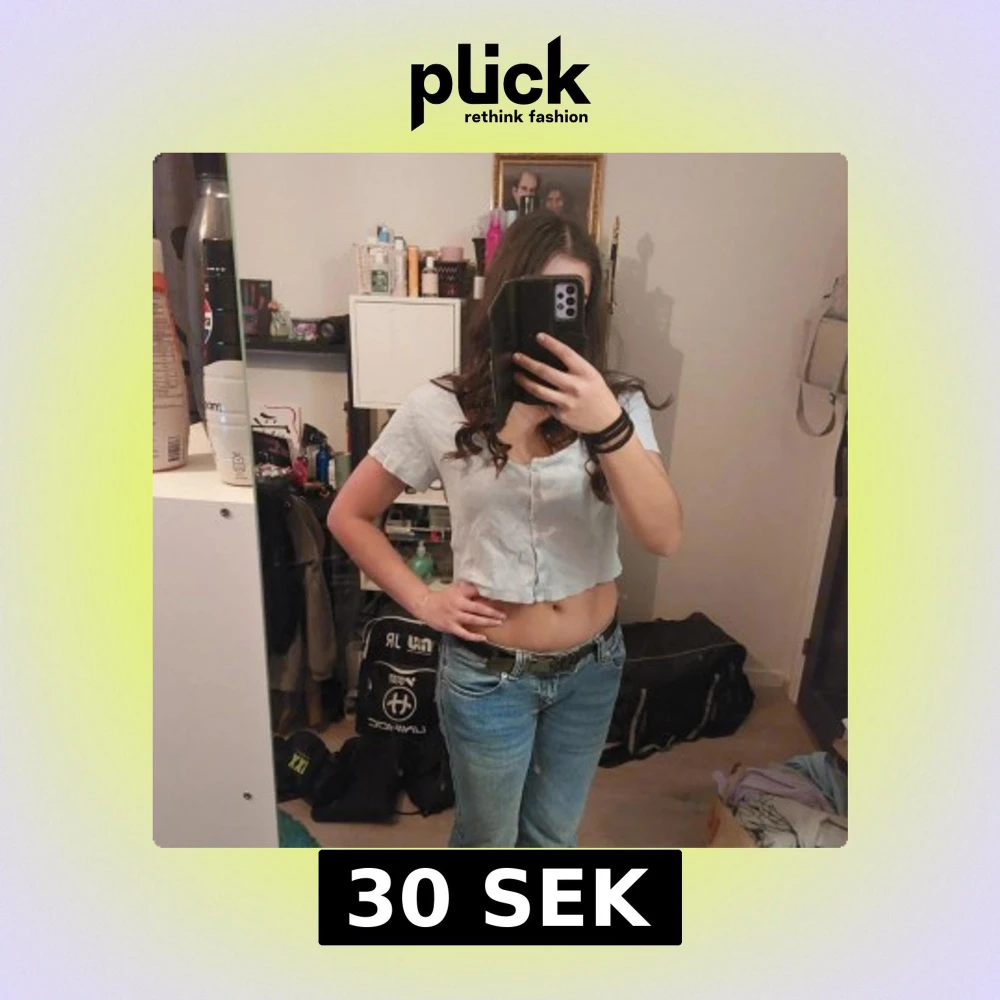 Säljer en ljusblå croppad blus med korta ärmar och knappar framtill. Perfekt för en avslappnad stil.
