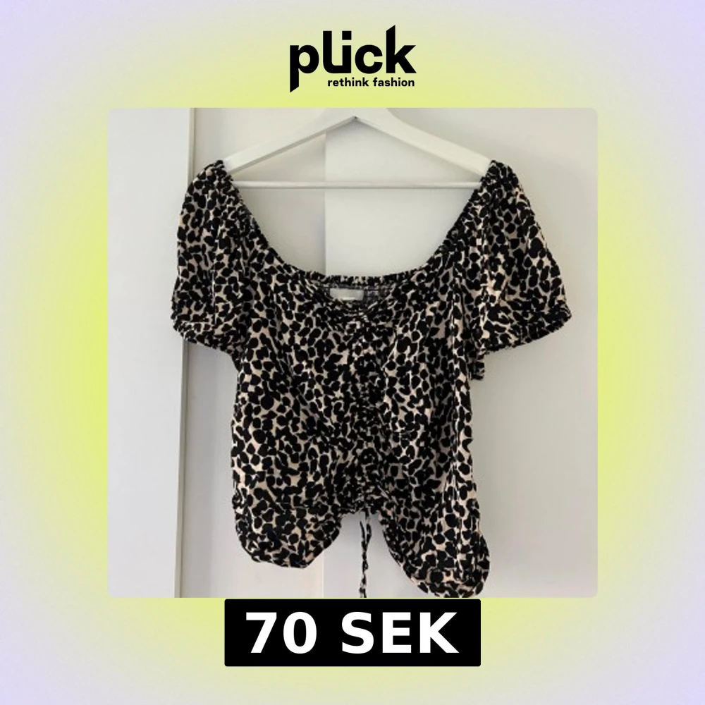 Leopardmönstrad topp från H&M - Säljer en kortärmad topp från H&M med snyggt leopardmönster i bruna och svarta toner. Modellen har rund halsringning och lätt puffade axlar för en trendig look. Tunt och mjukt material som känns skönt mot huden.