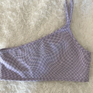 En lila rutig top som går runt ena axeln. Två smala axelband som tillhör samma sida. Väldigt kort. Skön till sommaren.