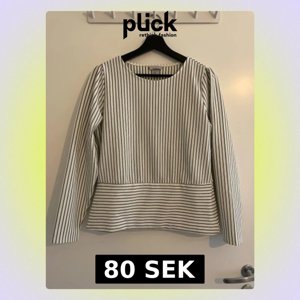 Snygg vit blus med svarta vertikala ränder. Modellen har rund halsringning, långa ärmar och en bredare randig panel nedtill som ger en cool kontrast. Perfekt att styla med jeans eller kjol för en trendig look.