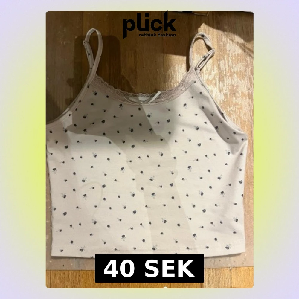 Supersöt ljus linnetopp med små mörkblå blommor och tunna axelband. Toppen har en fin spetskant upptill och en liten rosett i mitten. Perfekt till sommaren och enkel att matcha med jeans eller kjol.