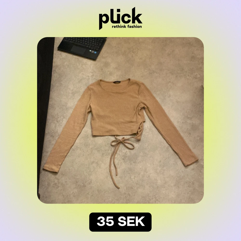 Säljer en superfin beige ribbad topp från Shein i storlek M. Den är croppad och har långa ärmar med en snygg knytning i midjan. Perfekt för både vardag och fest! 🧡
