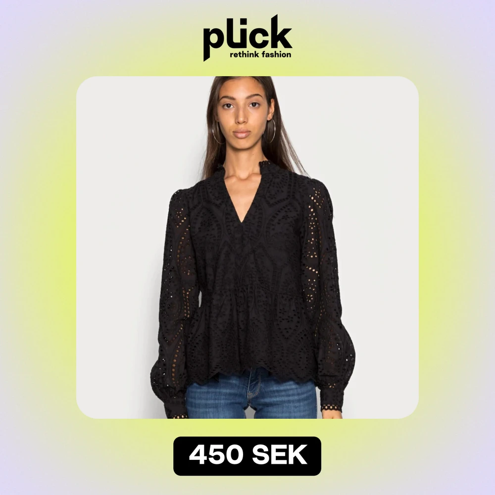 Snygg svart blus med v-ringning och spetsdetaljer. Blusen har långa ärmar och ett fint mönster som ger en elegant touch. Perfekt för både vardag och fest!