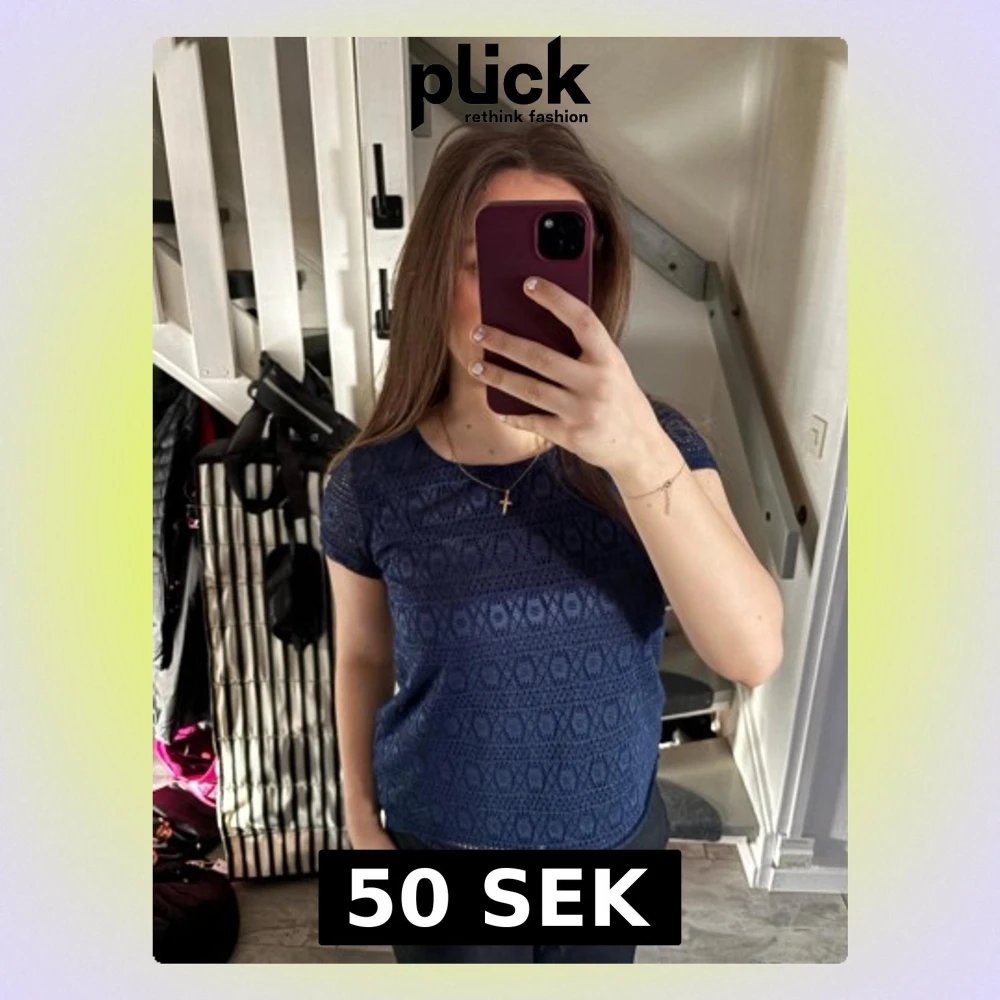 Snygg mörkblå blus med korta ärmar och rund halsringning. Blusen har ett diskret spetsmönster över hela tyget som ger en trendig look. Perfekt att matcha med både jeans och kjol. Märket syns på etiketten men är otydligt. Storlek saknas men passar både S och M💖