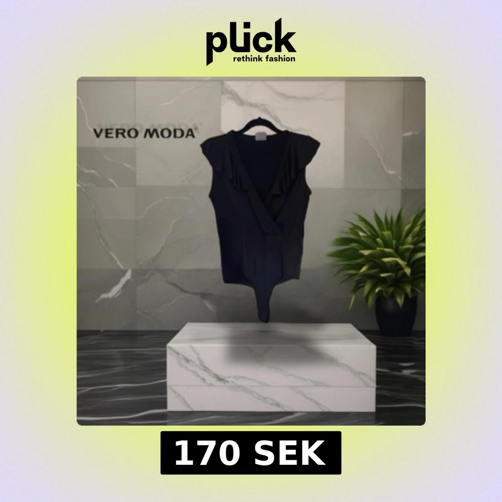 Svart ärmlös bodysuit med omlott-skärning och djup v-ringning framtill. Volangdetaljer vid axlar och längs ringningen ger en snygg touch. Tillverkad i mjukt, stretchigt material.