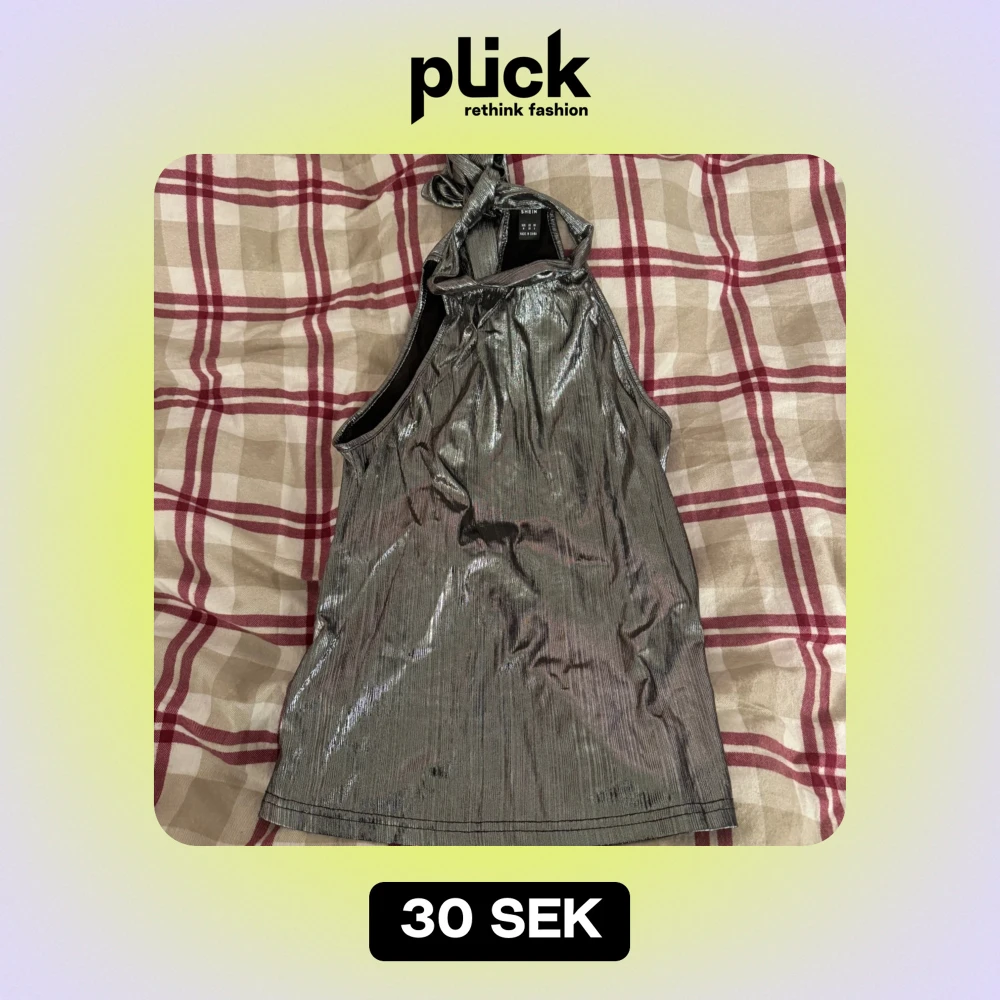 Snygg glittrig halterneck-top i silverfärg, perfekt för festliga tillfällen. Toppen har en knytning i nacken och är ärmlös, vilket ger en elegant look. Materialet är glansigt och fångar ljuset på ett coolt sätt. Perfekt för en utekväll eller nyårsfest!