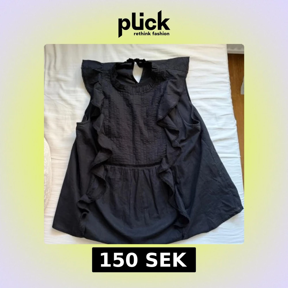 Supersnygg svart blus med volanger längs sidorna och axlarna. Hög hals med knytning i nacken och ärmlös design. Perfekt för dig som gillar en trendig och feminin look. Tunt, lätt tyg som känns luftigt.