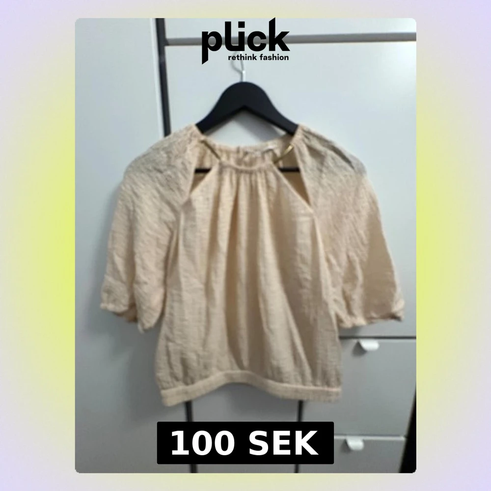 Säljer en beige blus från Second Female i storlek M. Blusen har en luftig och krinklad struktur, rund hals med guldfärgad metallring och korta puffärmar med resår. Perfekt för dig som gillar en chill och trendig look.
