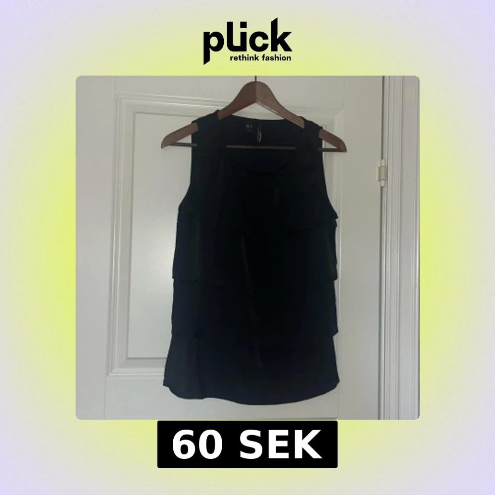 Säljer en svart ärmlös blus från Mango med snygga volanglager framtill. Toppen har rund halsringning och är tillverkad i ett lätt, glansigt tyg som ger en elegant känsla.