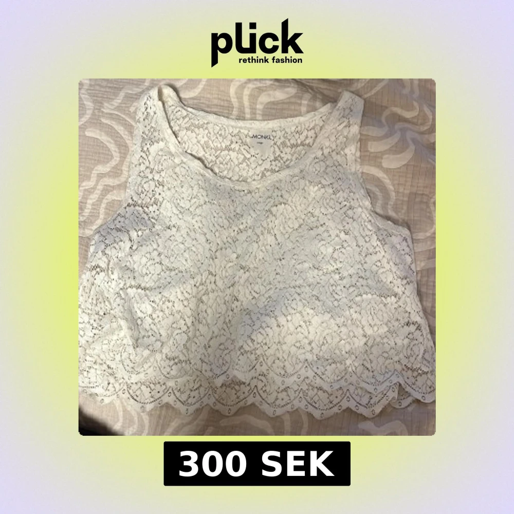 Superfin vit linnetopp från Monki i spets med blommigt mönster. Toppen är ärmlös och har en croppad passform med vågig kant nedtill. Perfekt för sommarens alla tillfällen när du vill känna dig extra söt.