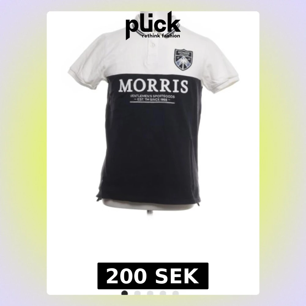 Säljer en snygg pikétröja från Morris i storlek M. Toppen är svart och vit med kontrastfärgade partier, korta ärmar och klassisk krage med ränder. Framsidan har Morris-logga och tryck. Materialet är mjuk bomull, perfekt för en chill och sportig look.