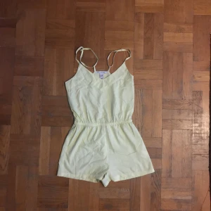 Ljusgul jumpsuit från NLY Trend. Aldrig använd. Den var sönder i banden när jag fick den så har knutit dem, men det går definitivt att reparera enkelt.
