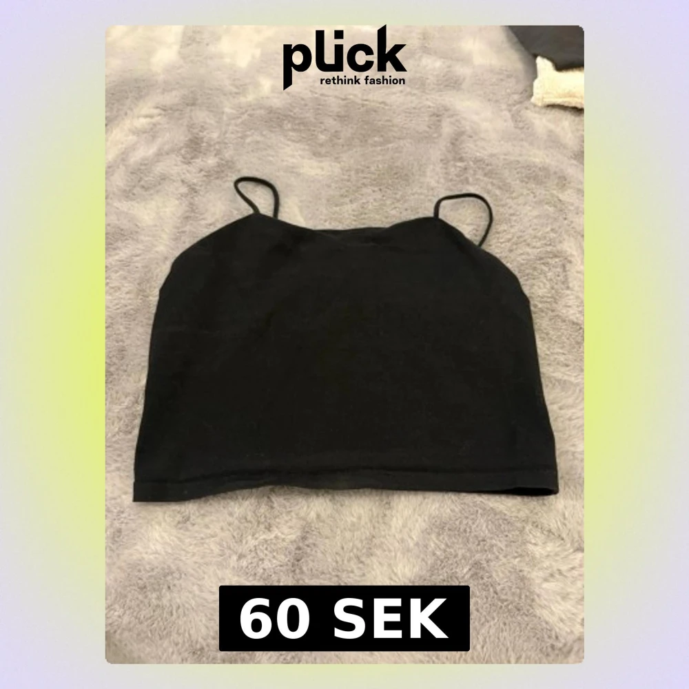 En enkel svart croppad linnetopp med tunna axelband. Toppen är rak i modellen och sydd i mjukt tyg, perfekt till sommaren eller för att styla lager på lager. Inget synligt märke på etiketten.