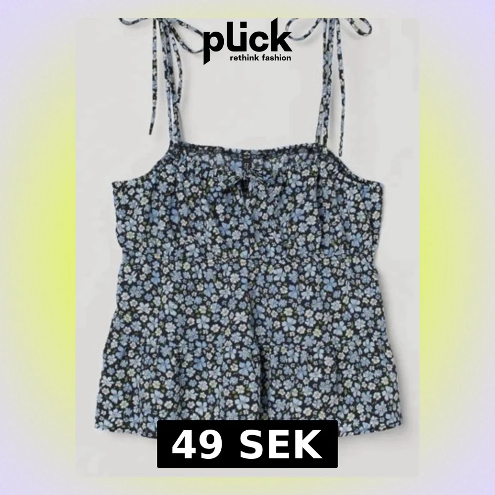 Söt linnetopp med blått och vitt blommönster på svart botten. Toppen har smala axelband med knyt och en liten rosett framtill. Perfekt för varma dagar och enkel att styla med jeans eller kjol.