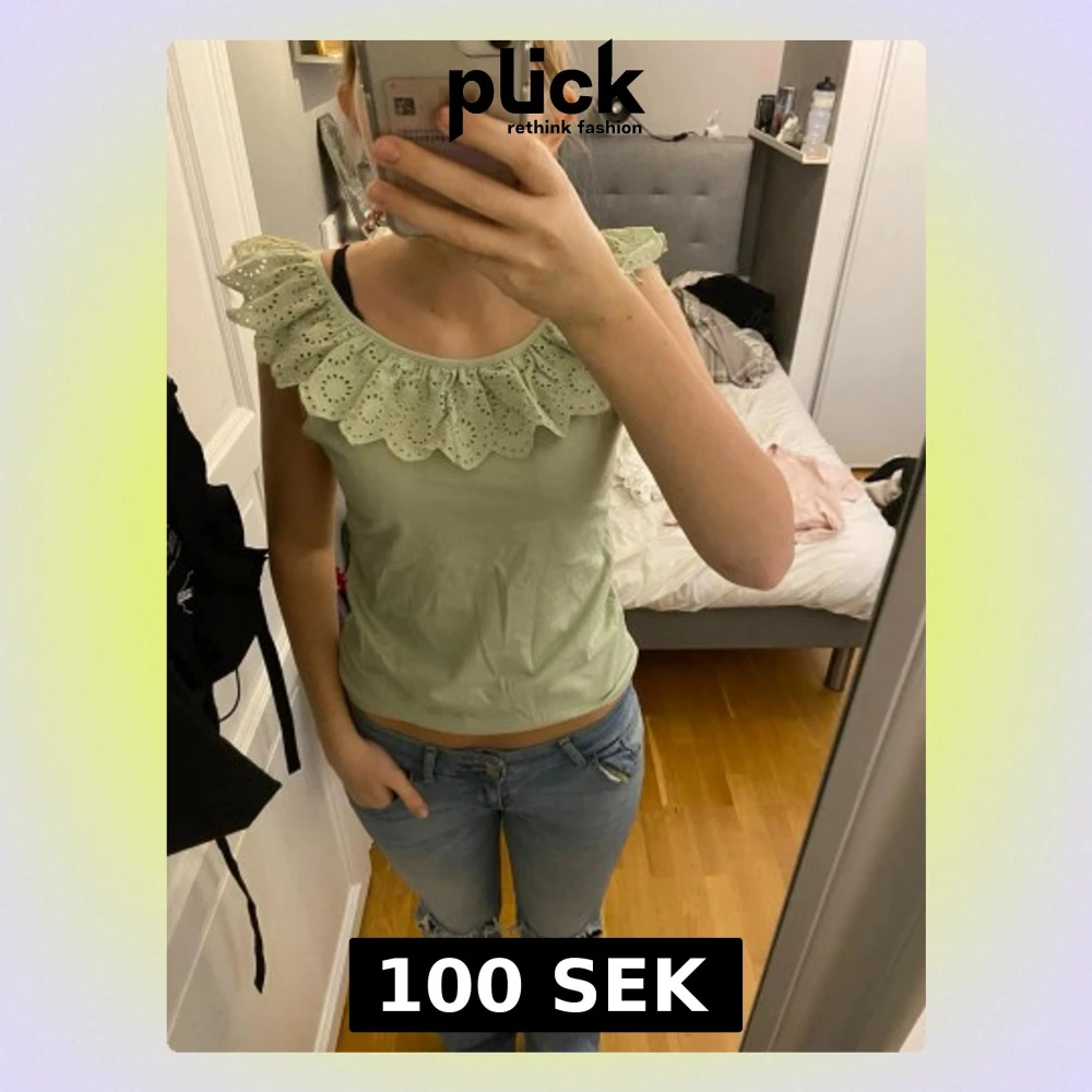 Säljer en ljusgrön topp från Primark i mjuk bomull. Toppen har en stor broderad volang runt halsringningen som kan bäras både på axlarna och offshoulder. Perfekt för vår och sommar, superfin färg och detaljerad spetsvolang.