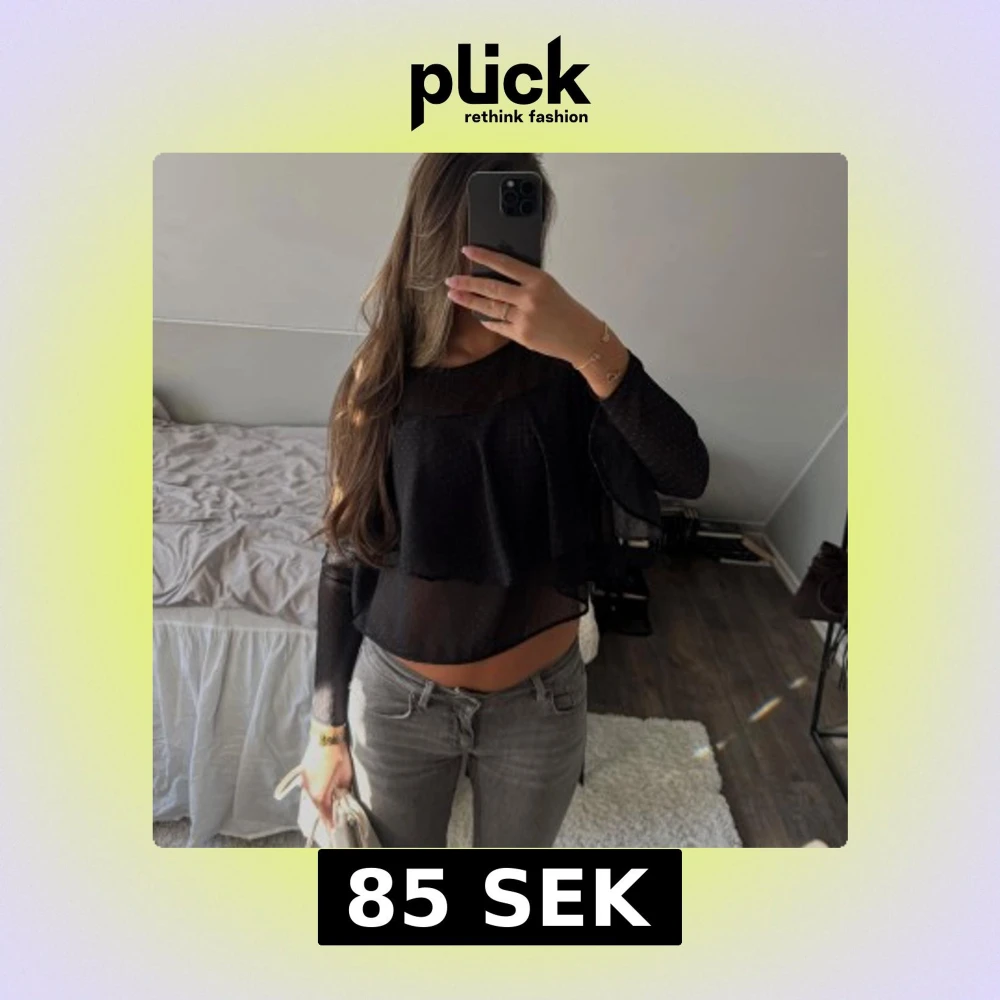 Säljer en svart transparent blus med diskret prickigt mönster och volangdetaljer framtill. Blusen är croppad och har långa ärmar i ett lätt och luftigt material. Perfekt för dig som gillar en trendig och luftig look.
