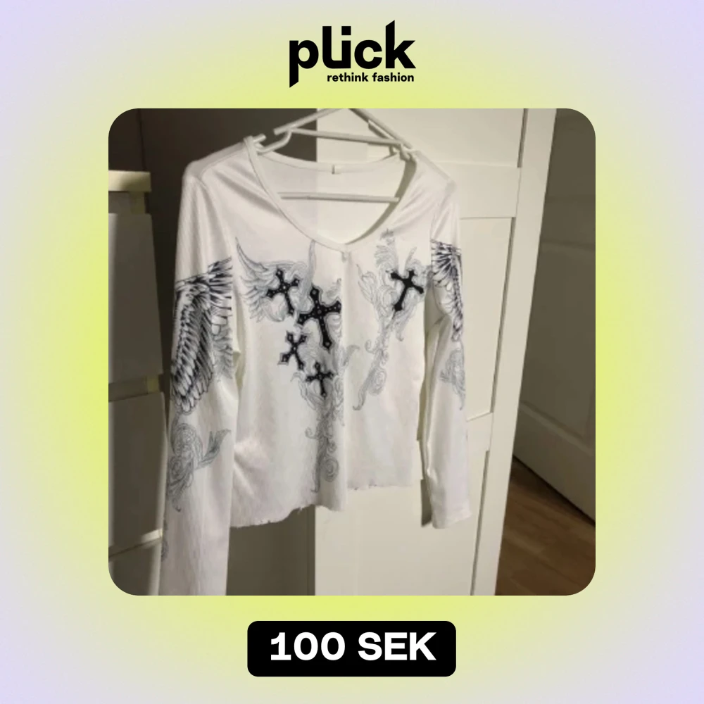 En snygg långärmad vit tröja med tryck på. Den är även klippt längst ner.