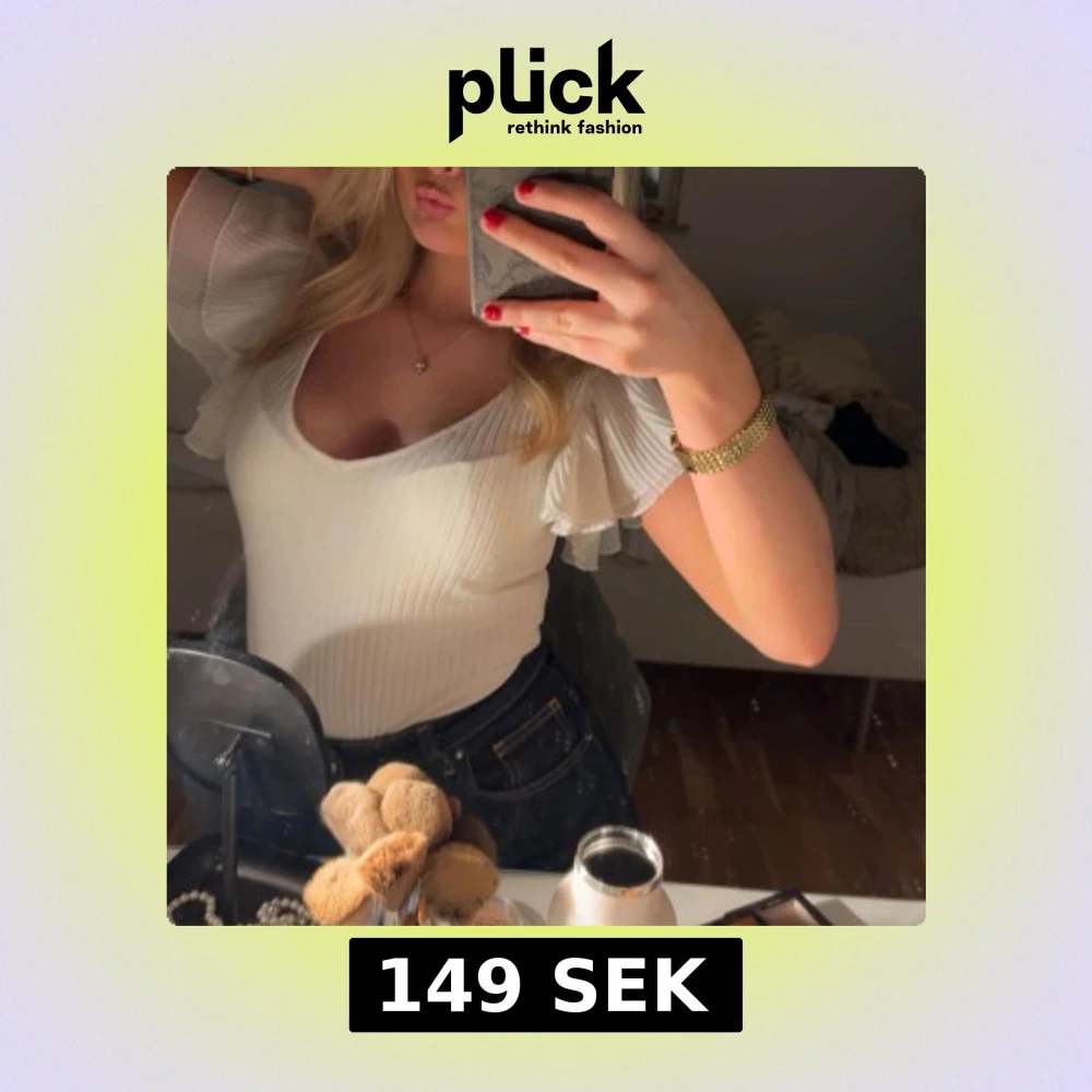 Säljer en vit ribbad body med djup urringning och volangärmar. Bodyn har en figurnära passform och är tillverkad i ett stretchigt material som sitter snyggt på kroppen. Perfekt att styla med jeans eller kjol för en trendig look.
