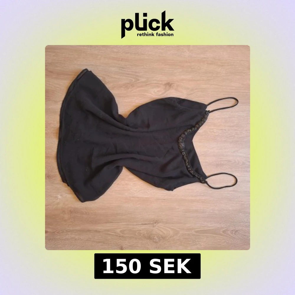 Säljer en svart linnetopp med tunna axelband och dekorativ spets längs urringningen. Toppen har en enkel och stilren design, perfekt att matcha med olika outfits. Materialet känns mjukt och följsamt.