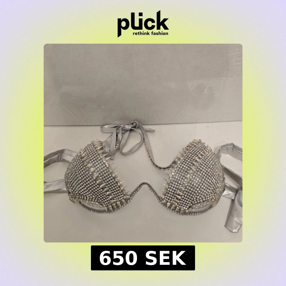 Supersnygg bikiniöverdel i metallic-silver med massor av glittrande strass och coola silverfärgade nitar. Knytband i nacken och ryggen för perfekt passform. Perfekt för dig som vill sticka ut på stranden eller poolpartyt.