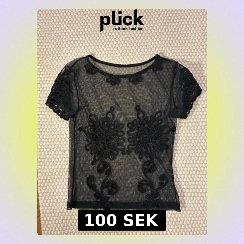 Säljer en transparent svart mesh topp med korta ärmar och dekorativa broderade blommönster framtill och på ärmarna. Toppen har rund halsringning och är figurnära i modellen. Perfekt att styla över ett linne eller bralette.