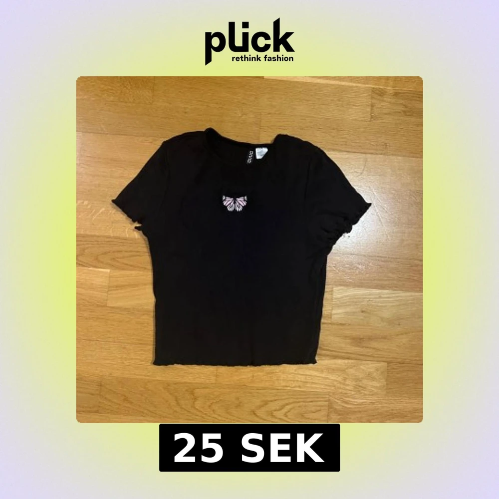 Svart croppad topp från Divided med en liten broderad fjäril i rosa och vitt på bröstet. T-shirten har korta ärmar och lätt vågig kant nertill för en extra cool vibe. Perfekt att matcha med jeans eller kjol.