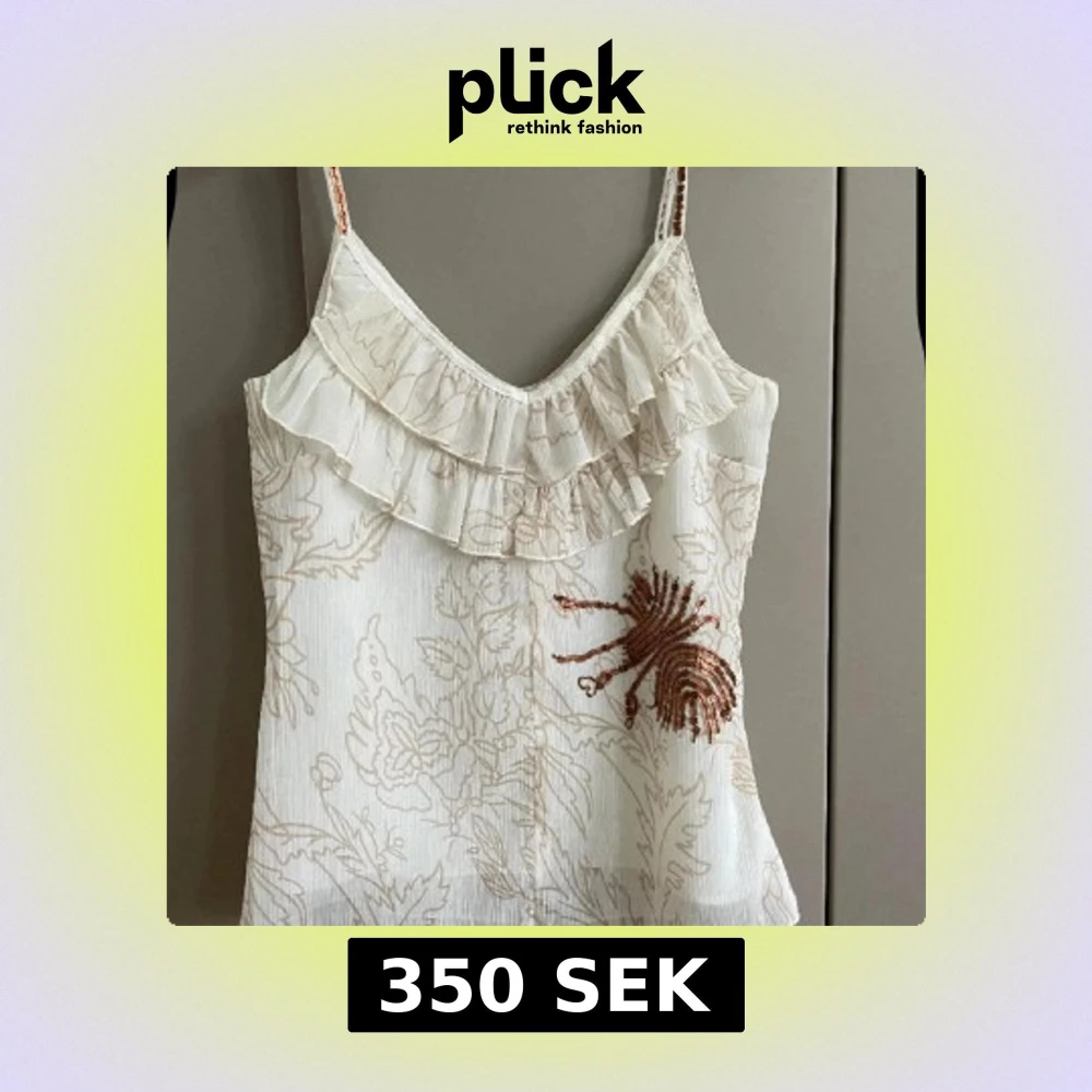 Säljer en söt vit linne/topp med tunna axelband, volang vid urringningen och ett unikt paljettbroderi i kopparfärg framtill. Toppen har ett diskret blommönster i beige och är perfekt för sommardagar.