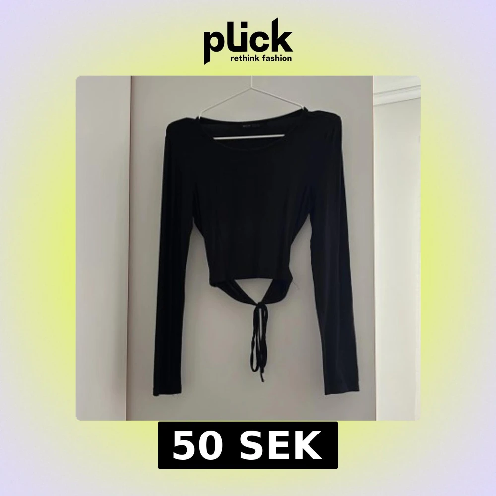 Säljer en svart långärmad topp med croppad passform och knyt backtill. Toppen har en rund halsringning och är tillverkad i ett stretchigt material som sitter snyggt på kroppen. Perfekt till jeans eller kjol.