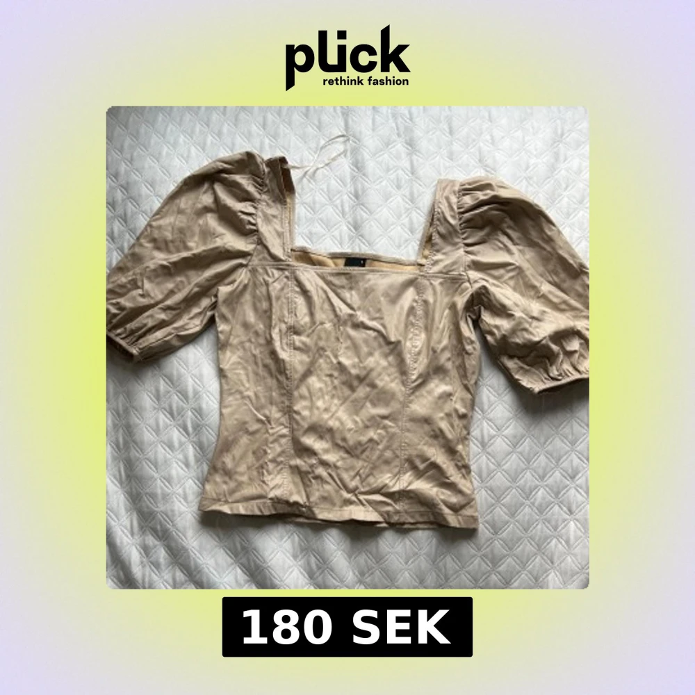 Säljer en elegant beige skinn topp med puffiga kortärmar och fyrkantig urringning. Perfekt för en stilren look. Blusen har en figurnära passform och är verkligen speciell. Använt den 1 gång bara 🦋🤩ljuset på bilden är konstigt men färgen är som den andra bilden som visar materialet🥰