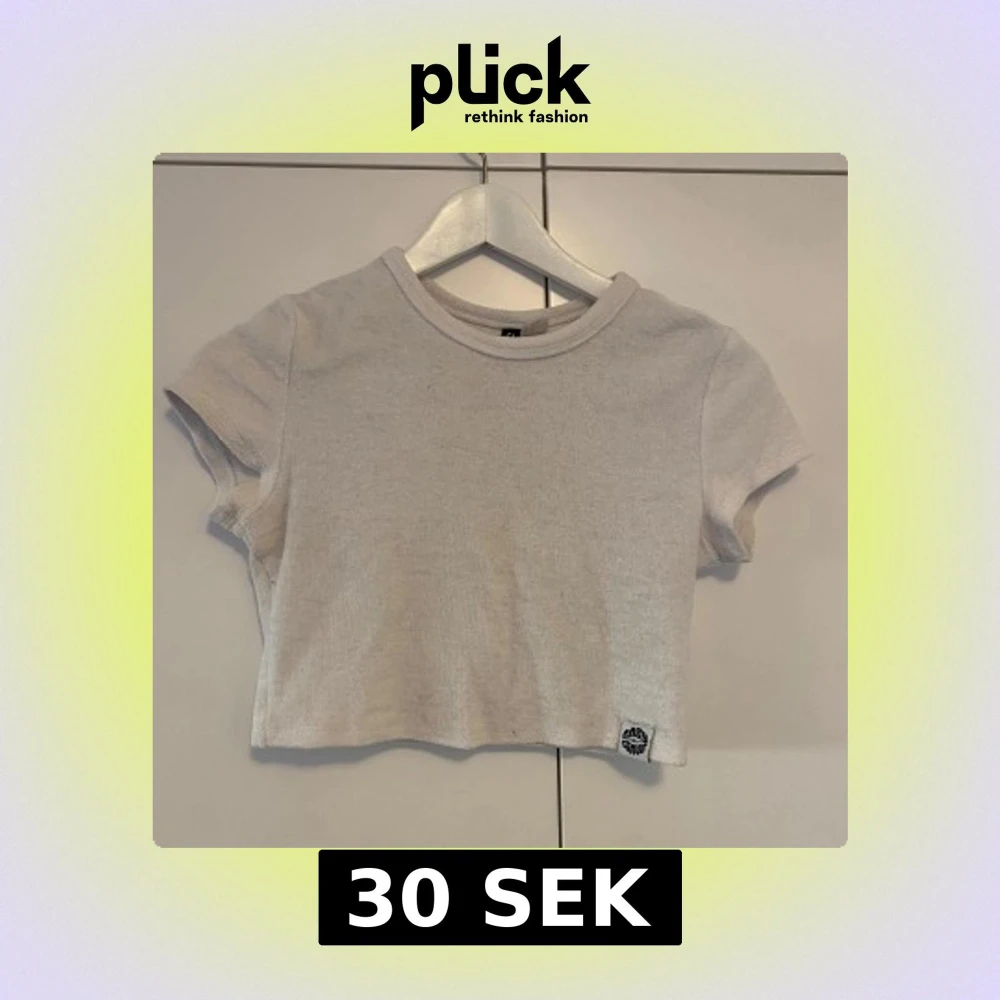 Säljer en vit croppad t-shirt från Divided med korta ärmar och rund halsringning. Materialet är frottéliknande och har en liten Cozy Wave Surf Club-lapp nertill.