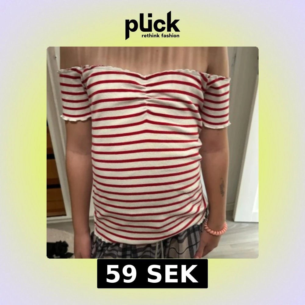 Superfin offshoulder topp från FB Sister i vitt och rött med horisontella ränder. Toppen har korta ärmar, rynkdetalj framtill och vågig kant vid hals och ärmslut. Perfekt för en somrig look och passar snyggt till både jeans och kjol.